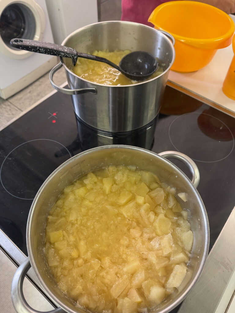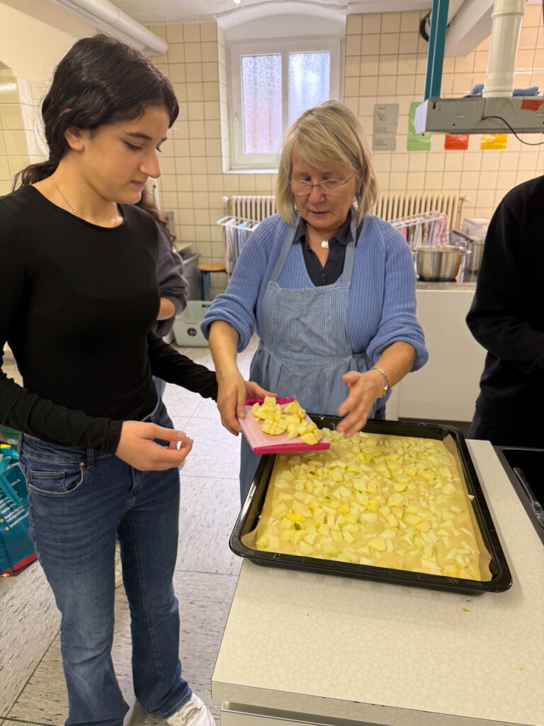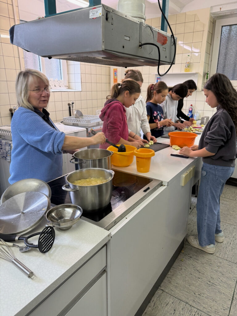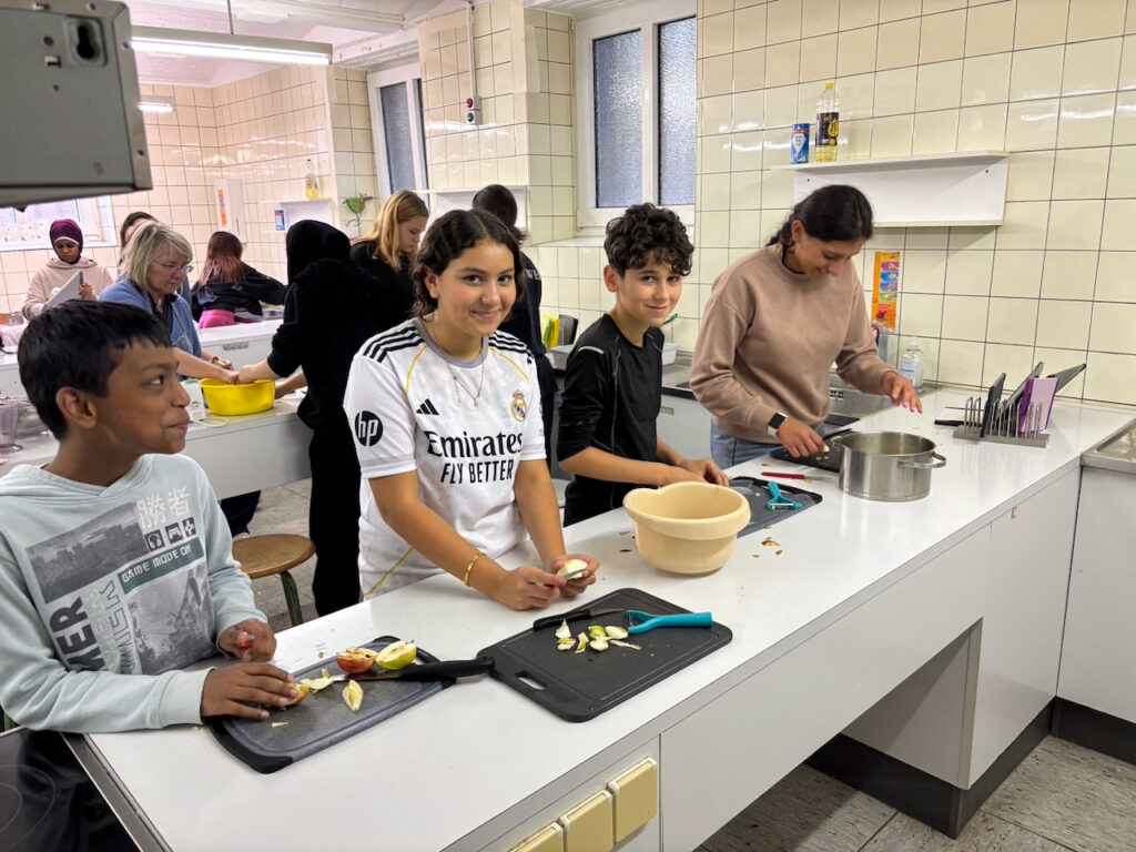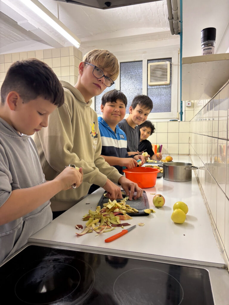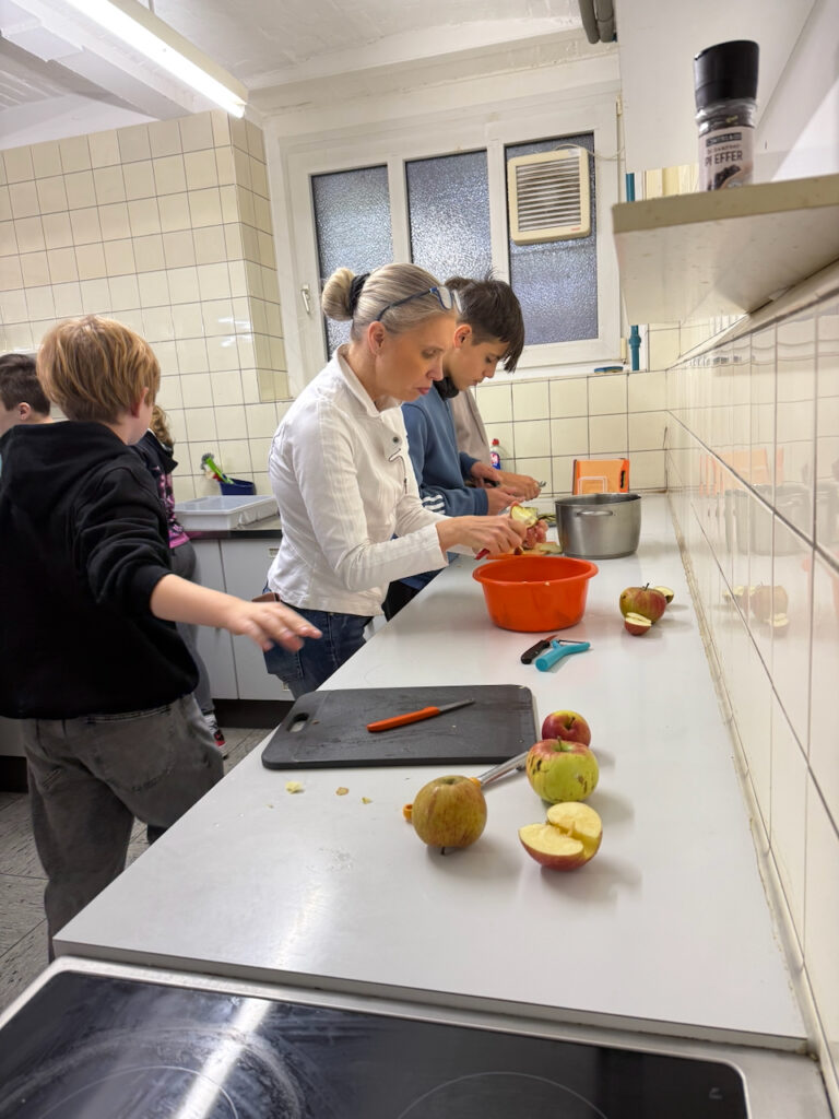 Am Projekttag „Gesund leben lernen“ drehte sich alles um das Thema „Der Apfel“. Die Schülerinnen und Schüler durchliefen drei spannende Stationen: In der Sporthalle stand Bewegung im Mittelpunkt, anschließend erarbeiteten sie mit den iPads theoretisches Wissen rund um den Apfel und gesunde Ernährung, und in der Küche stellten sie gemeinsam Apfelkuchen und Apfelmus her. Alle Kinder waren mit Begeisterung dabei – ein rundum gelungener Tag!