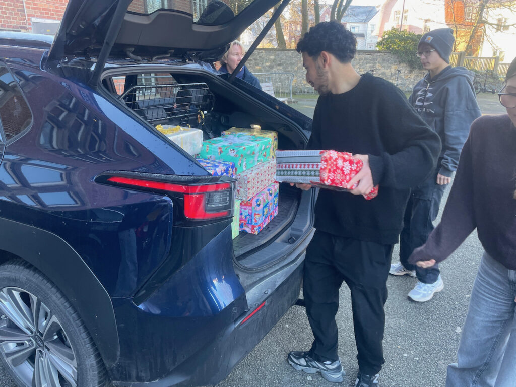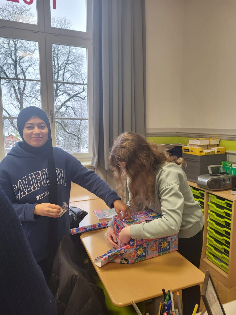 Am Freitag, den 21.11.2025, überreichten Schülerinnen und Schüler insgesamt 38 Päckchen an Frau Tanja Lange von der Schöninger Sammelstelle des Hilfswerks „Hoffnungsträger Ost“.
